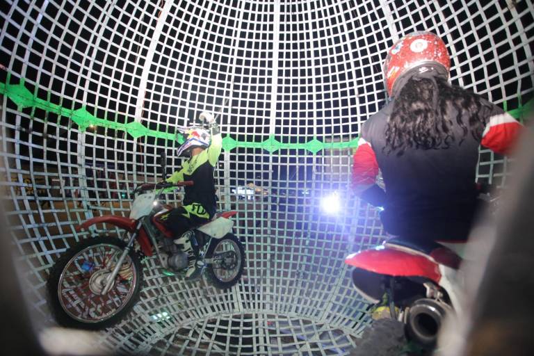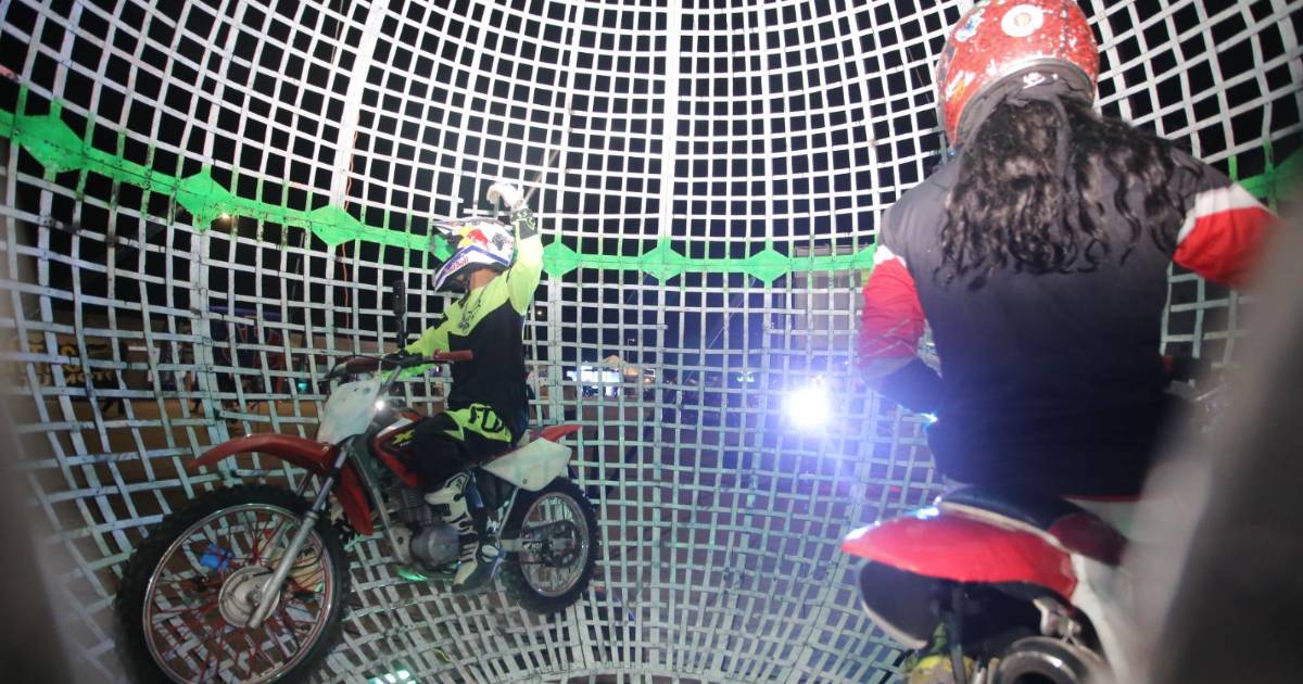 Ante varios asistentes, el equipo de jóvenes denominado “Locos Riders” ofreció un show cargado de riesgo, velocidad y destreza, al dominar la gravedad dentro de la estructura cilíndrica mientras montaban sus motocicletas a gran velocidad.
