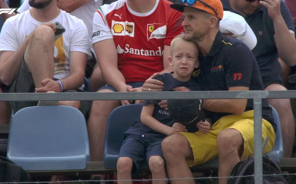 Eso sí, cabe señalar que el pequeño iba vestido con los colores de AlphaTauri, aunque no ocultó su tristeza al ver al mexicano impactado contra las barreras.