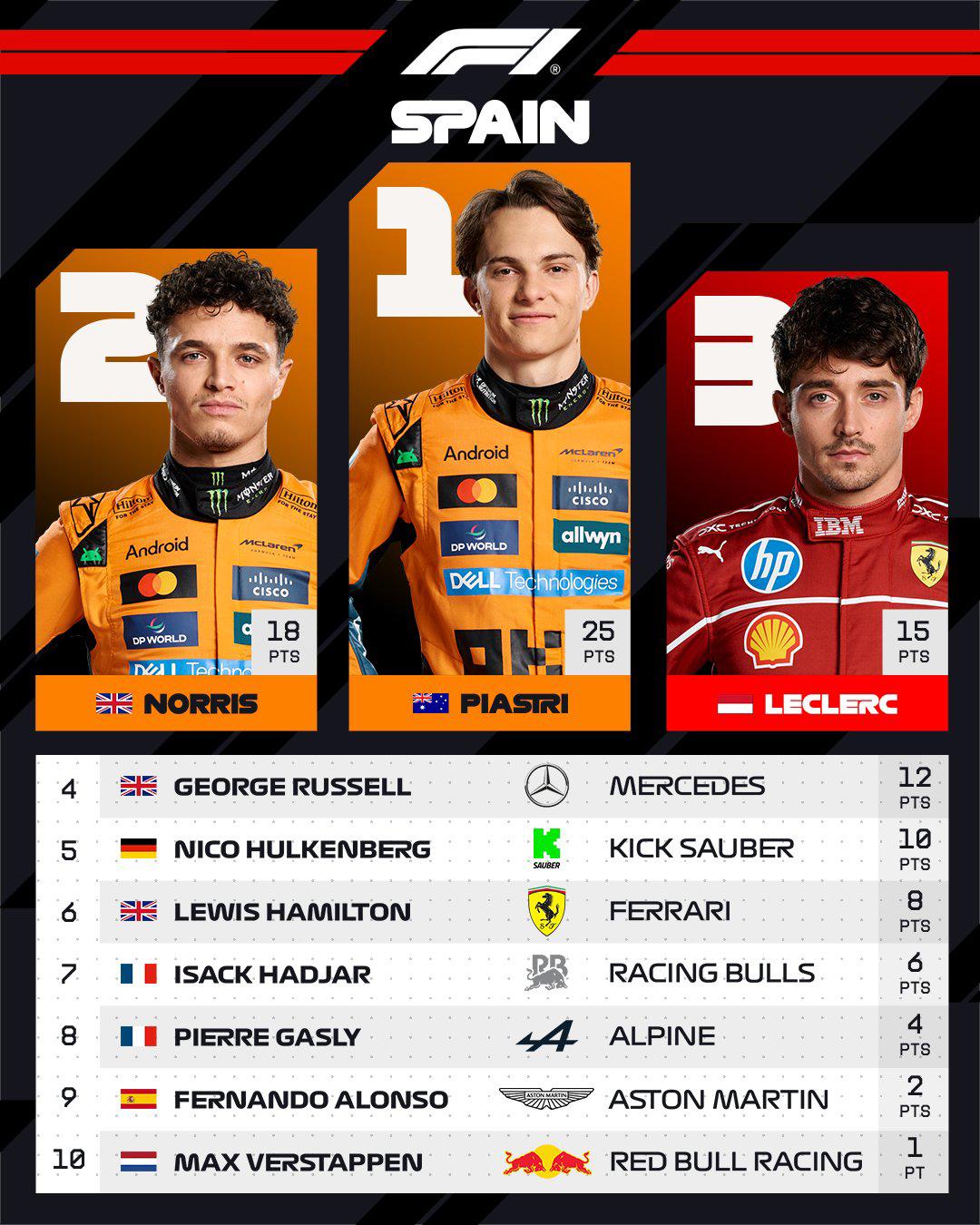 El piloto australiano Oscar Piastri se llevó la victoria en el Gran Premio de España 2025, consolidando su liderazgo en el Campeonato de Pilotos de la Fórmula 1 y asegurando el tercer 1-2 de McLaren en la temporada junto a Lando Norris, quien terminó segundo. Charles Leclerc completó el podio en un cierre lleno de tensión y estrategia.