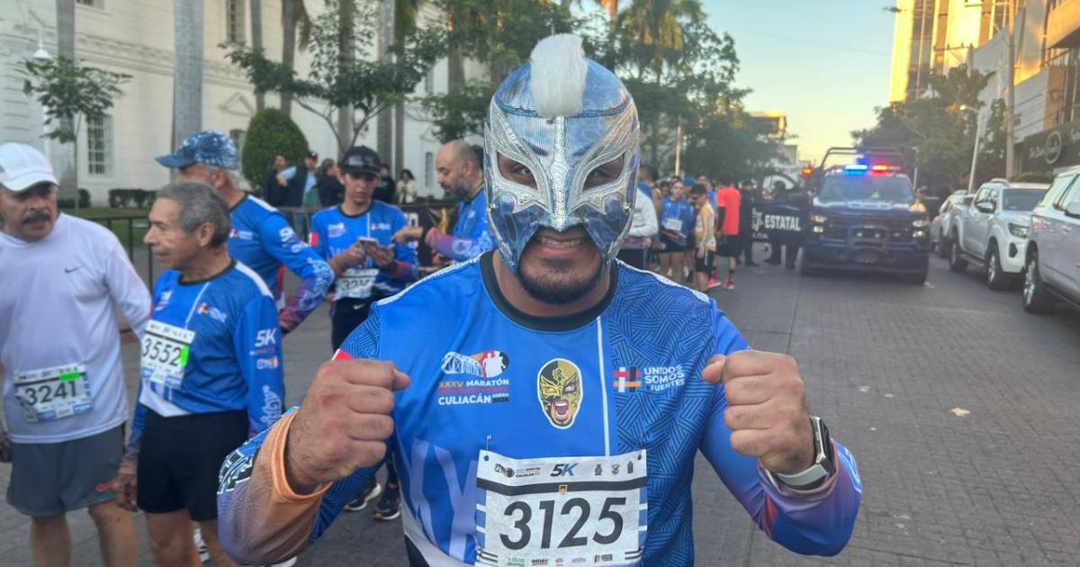 Ronin, luchador profesional con ocho años de trayectoria, cambió por una mañana las botas de lucha por tenis para participar en el Maratón Internacional Culiacán 2026, motivado por la convivencia familiar y el fomento de la actividad física.