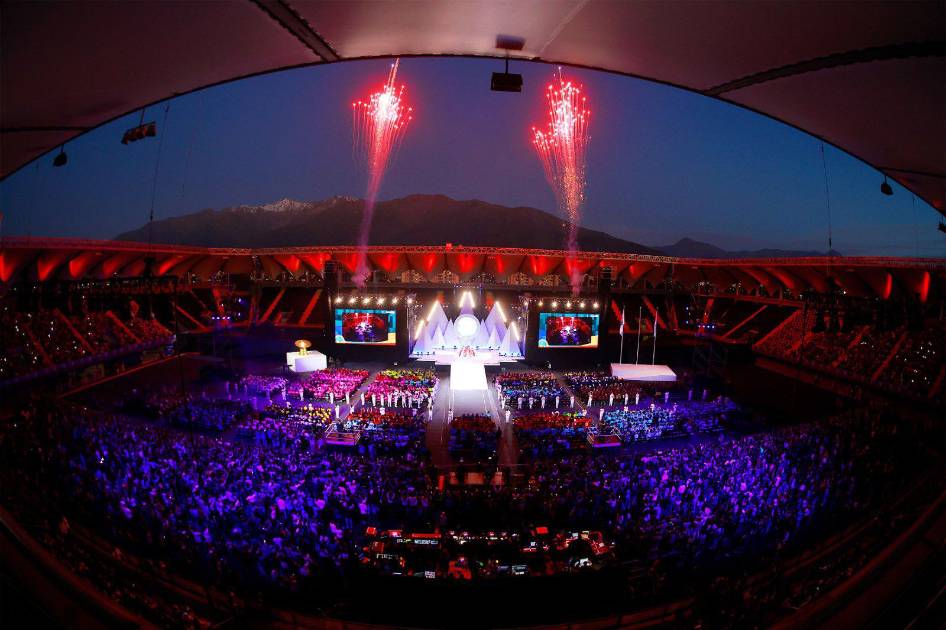 El Estadio Bicentenario de la Florida albergó la Clausura, que inició con las chinchineras y chinchineros que tocaron el bombo, para dar paso al joven esquiador y medallista chileno en Santiago 2023, Matías González, quien entregó la bandera y se entonó su Himno Nacional.