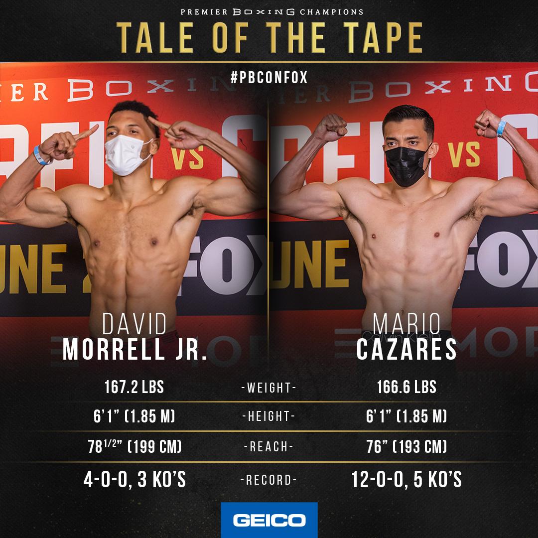 En el pesaje oficial de este sábado, Morrell marcó 167.2 libras, mientras que Cazares detuvo el péndulo en 166.6 libras.
