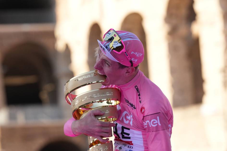 El corredor del UAE Team Emirates, de 25 años, se había enfundado la maglia rosa de líder desde que ganó la segunda etapa, la primera de sus seis victorias de etapa, y terminó el recorrido llano de 125 km del domingo a salvo en el pelotón, ya que Tim Merlier ganó la etapa.