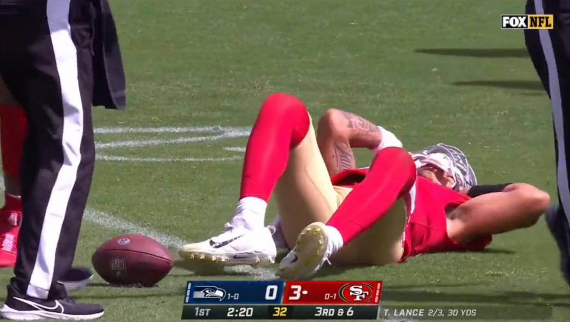 El mariscal de campo titular de San Francisco, Trey Lance, salió del juego en que los 49ers vencieron 27-7 a los Seahawks el domingo por la tarde al lesionarse el tobillo derecho al principios del primer cuarto.