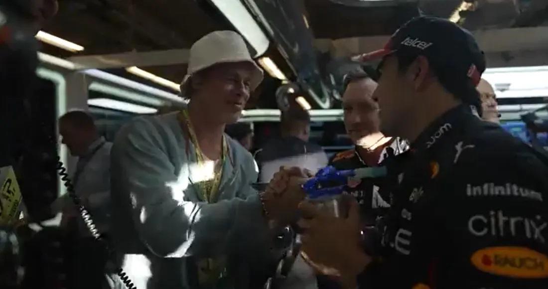 “Es un placer conocerte, qué bueno fue verte en la carrera”, le dice Brad Pitt a “Checo” Pérez, quien en seguida le preguntó si era “su primera vez”.