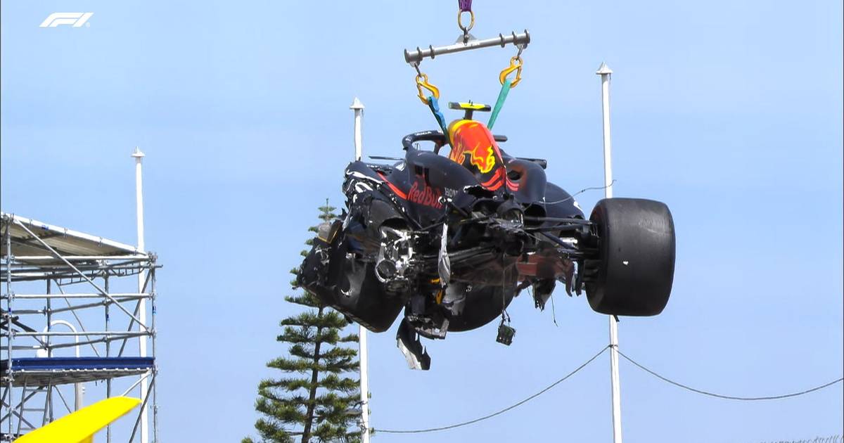 El incidente se dio antes de la subida del casino y dejó el peor saldo para el mexicano: su Red Bull quedó totalmente destrozado, aunque sin consecuencias para el piloto.