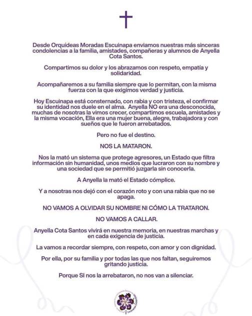 “Aunque nos la arrebataron, no la van a borrar, Anyella Cota Santos va a seguir en nosotras, en nuestra voz, en nuestra rabia y en nuestra lucha”, se señala en el posicionamiento del colectivo de Escuinapa.