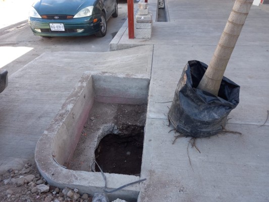 "Abren boquetes en banqueta recién construida para plantar palmeras en el mercado municipal de Escuinapa"