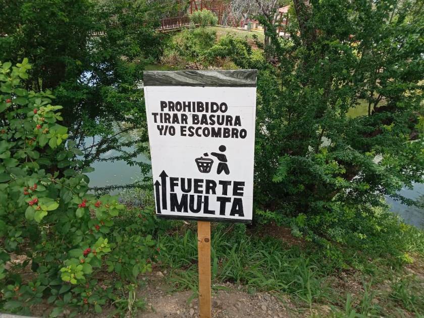 “Prohibido tirar basura y/o escombro... fuerte multa”, se puede leer en el anuncio colocado en el margen de la laguna colindante al puente colgante.