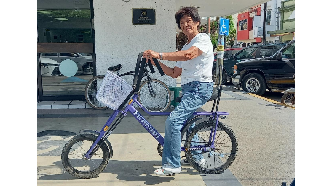 ESCUINAPA._ ¡Gracias!, señala con alegría doña Emma Gómez a lectores que después de saber su historia, remodelaron su vieja bicicleta modelo vagabundo, en la que transita por las calles del municipio.