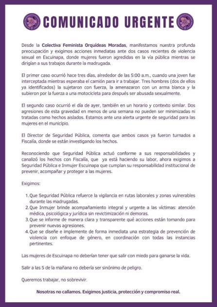 “Desde la colectiva de Orquídeas Moradas manifestamos nuestra profunda preocupación y exigimos acciones inmediatas ante dos casos recientes de violencia sexual en Escuinapa , dónde mujeres fueron agredidas en la vía pública mientras se dirigían a sus trabajos en la madrugada”, se señala.