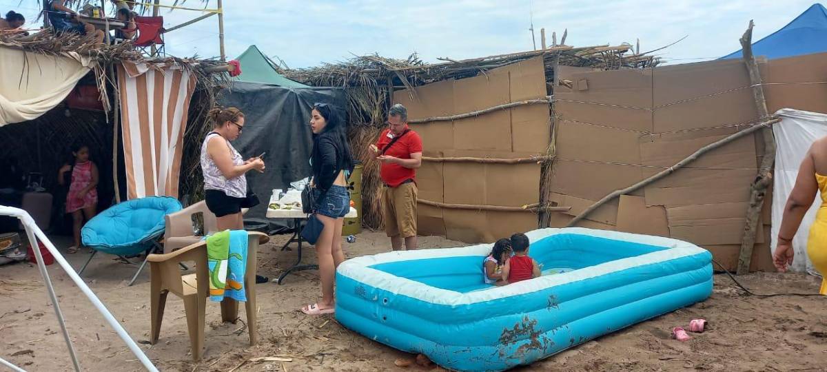 En algunas enramadas se ha optado por colocar albercas para los niños, mientras las familias asan carne o pescado fuera de estas y vigilan a los menores.