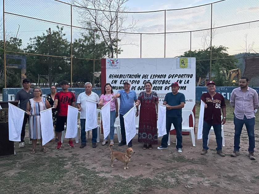 ROSARIO._ Atendiendo el llamado de los habitantes de Ojo de Agua de Osuna, la Alcaldesa de Rosario, Claudia Valdez Aguilar, dio el banderazo de rehabilitación del estadio de beisbol de la comunidad y anunció que también dará mantenimiento a la cancha de basquetbol adjunta.