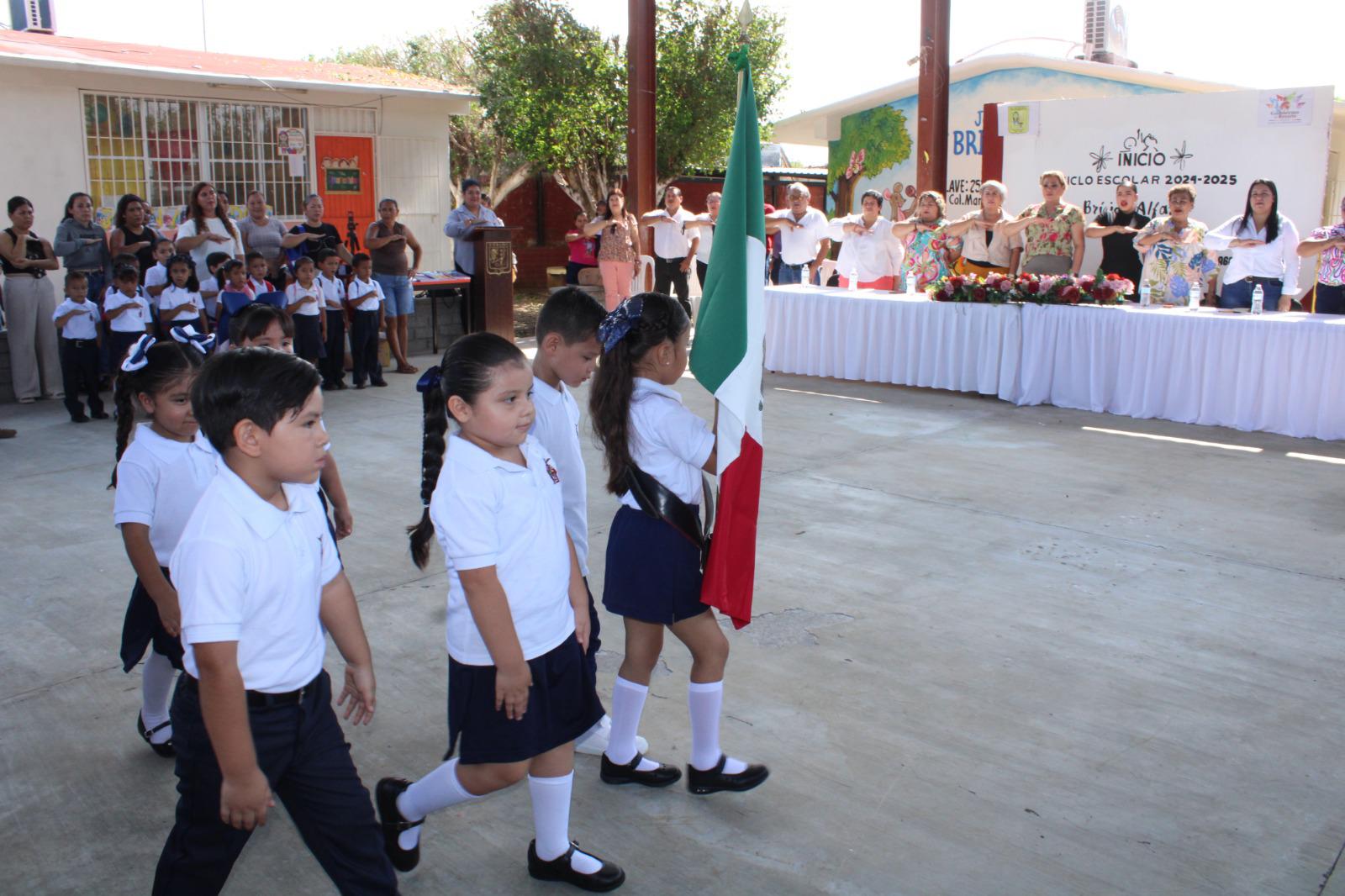 Fue en punto de las 9:00 horas que se inició el acto con el corte del listón marcando el ingreso de alumnos y padres al plantel en mención para continuar con el acto cívico que encabezaron la Alcaldesa Claudia Valdez Aguilar y la Jefa del Departamento de Educación Preescolar Federal, Magnolia Alva Quintero, funcionarios municipales y educativos.