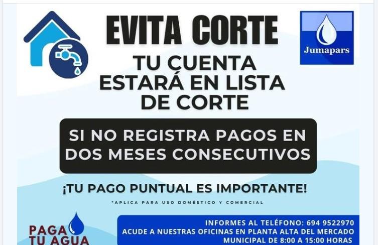 “La Junta Municipal de Agua Potable inicia programa de suspensión de servicio a ciudadanos morosos. ¡Ponte al corriente y evita el corte!”, se puede leer en el mensaje emitido por la autoridad municipal.