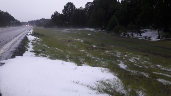 Lo blanco del granizo contrasta con lo verde de la vegetación de esta zona maderera y de turismo de naturaleza.
