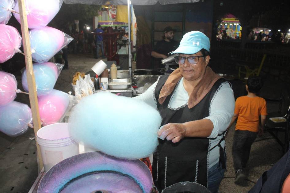 Originaria de Ciudad Juárez, Chihuahua, Belén menciona que aprendió a diversificarse, ya que además del algodón de azúcar, ofrece junto a su familia elotes, churros y quequis.