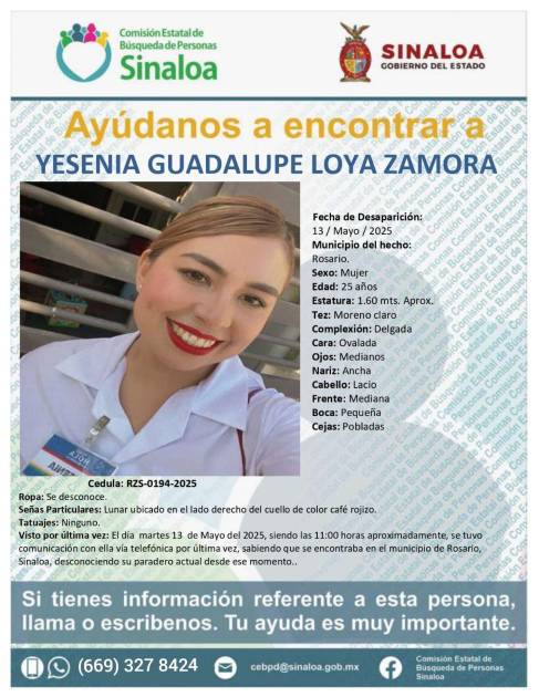 Así también se invita a quien posea algún tipo de información que considere pueda apoyar a localizarla se ponga en contacto al número telefónico (669) 327 8424 y/o al (669) 105 7953 o a través de correo: cebpd@sinaloa.gob.mx.