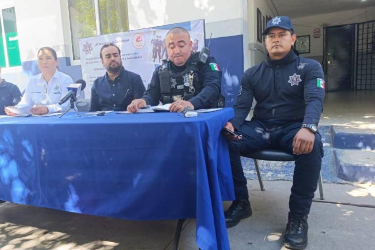 El Director de Seguridad Pública y Tránsito Municipal, Rosario Guadalupe Camacho García, presidió la conferencia de prensa para llamar a los jóvenes a formar parte de la corporación.