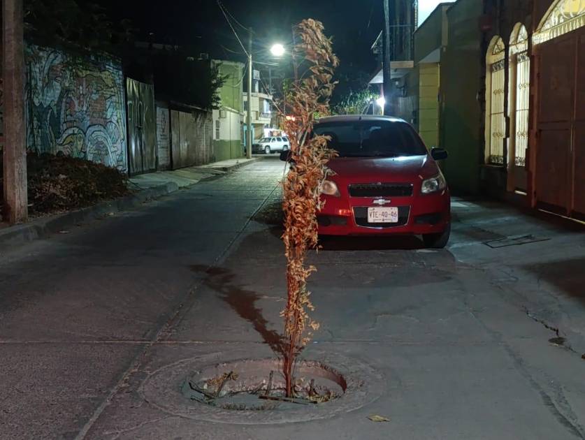 ESCUINAPA._ Un arbusto seco es la señal de “precaución” que vecinos del callejón 5 de mayo han colocado para que las personas se den cuenta del mal estado de una alcantarilla.