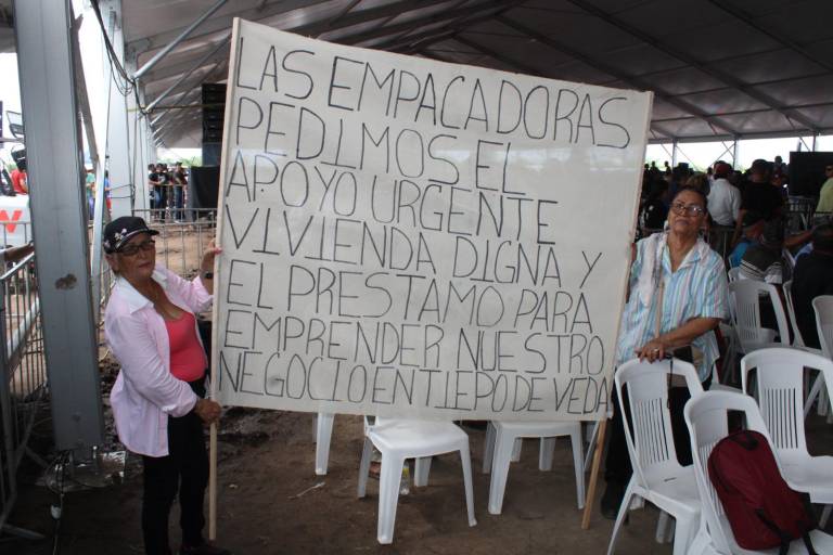 Eustolia Ochoa, junto a otros trabajadores de la empacadora de camarón de la congeladora “La Unión”, solicitaron que les completaran los pagos del apoyo del pescador pues son alrededor de mil 700 empleados a los que se les debe un pago de 3 mil 700 pesos.