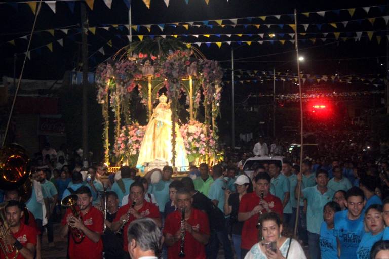 La música de banda y la pirotecnia que iba desde cortinas de luz hasta castillos anunciaban el avance de la imagen.