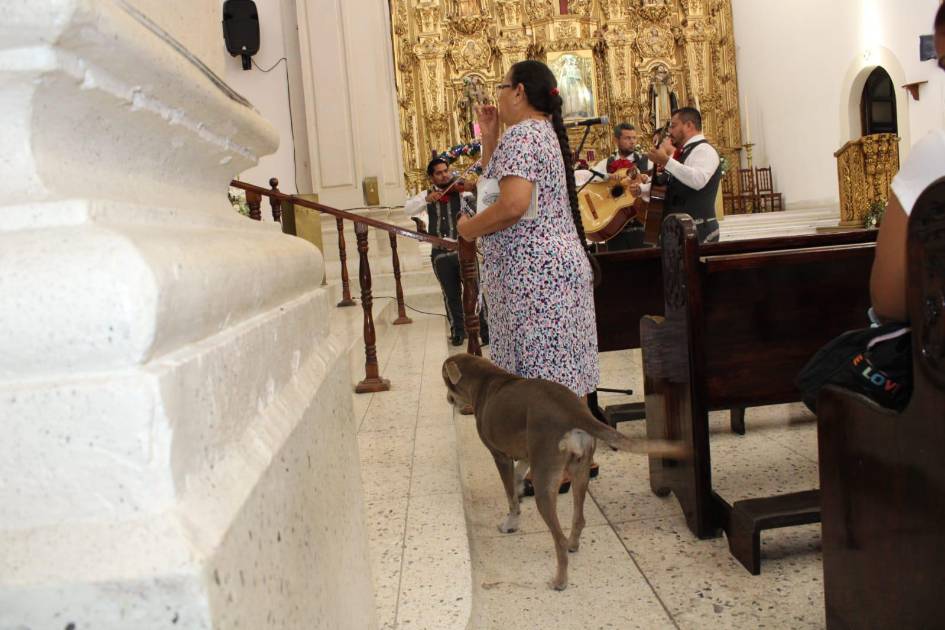 En ocasiones se desplaza entre las bancas del templo para que los más asiduos a la misa la acaricien pero cuidando no distraerlos de este momento de fe.
