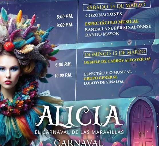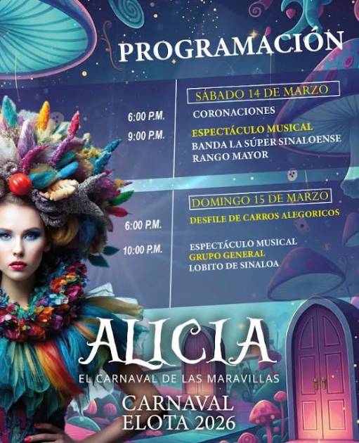 LA CRUZ, Elota._ El municipio de Elota se prepara para vivir una de sus máximas celebraciones con el Carnaval Elota 2026 “Alicia: El Carnaval de las Maravillas”, que se llevará a cabo el sábado 14 y domingo 15 de marzo, con una cartelera artística de primer nivel y eventos completamente gratuitos para el disfrute de las familias.