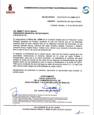 "De manera urgente gire sus apreciables instrucciones a la Junta Municipal de Agua Potable y Alcantarillado de Escuinapa para que restablezca la cloración de agua en todos los puntos de red", señala el Vocal Ejecutivo de Ceapas, Juan Ernesto Millán Pietsch.