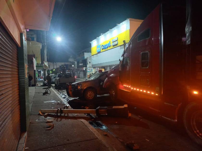 El impacto de los vehículos dejo daños materiales considerables en un consultorio dental y una lámpara de alumbrado público que fue arrancada de su base; en el sitio permanecen partes del tractocamión, restos de combustible que se tiró y se perciben huellas del frenado de los vehículos.