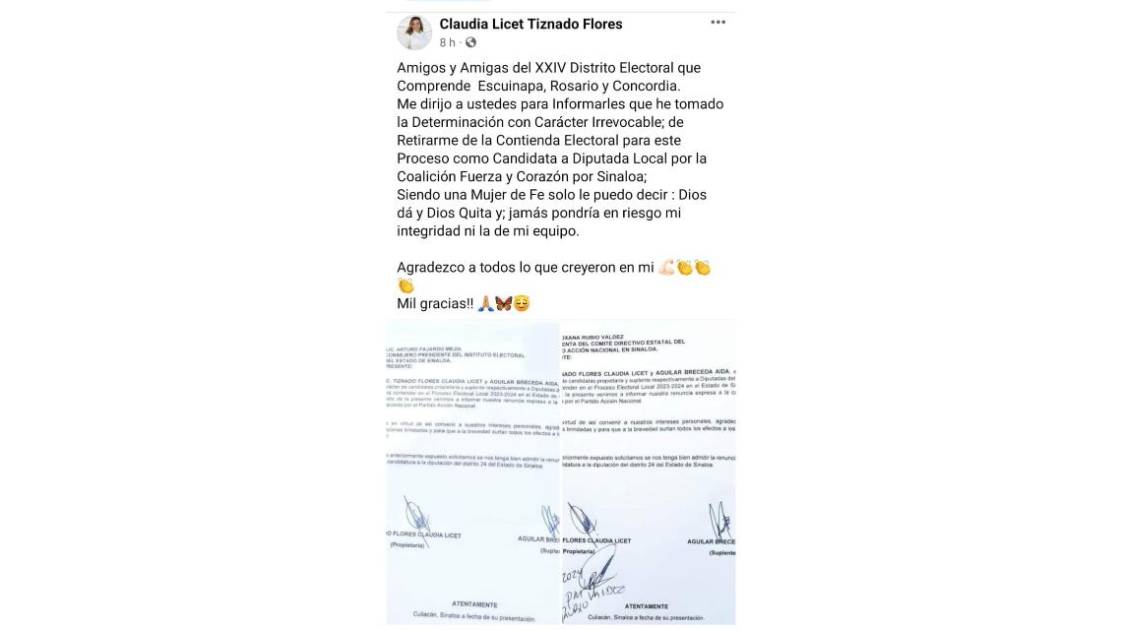 “Me dirijo a ustedes para informarles que he tomado la decisión con carácter irrevocable de retirarme de la contienda electoral para este proceso como candidata a Diputada Local por la coalición Fuerza y Corazón por Sinaloa”, señala.
