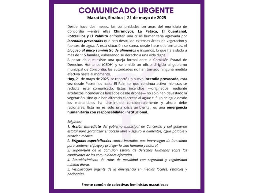 Una declaratoria de emergencia humanitaria en la sierra de Concordia fue la que emitió el Frente Común de Colectivas Feministas Mazatlecas, al señalar presuntos incendios provocados y bloqueo de suministro de alimento y agua a más de un centenar de familias de comunidades rurales.