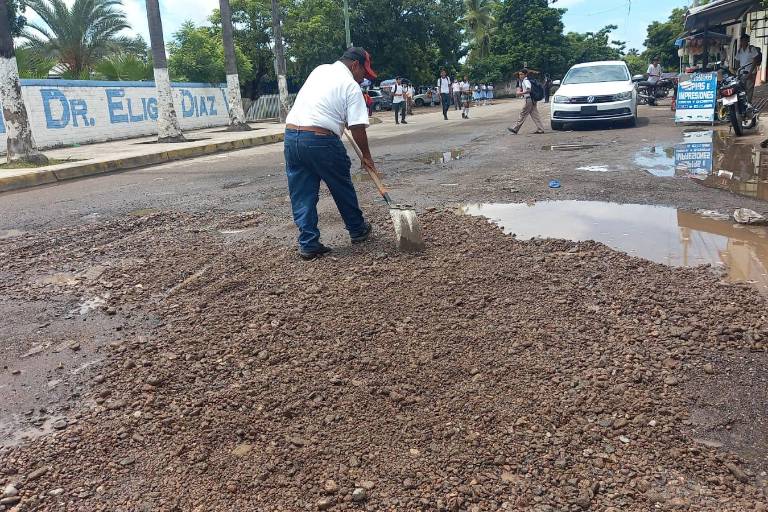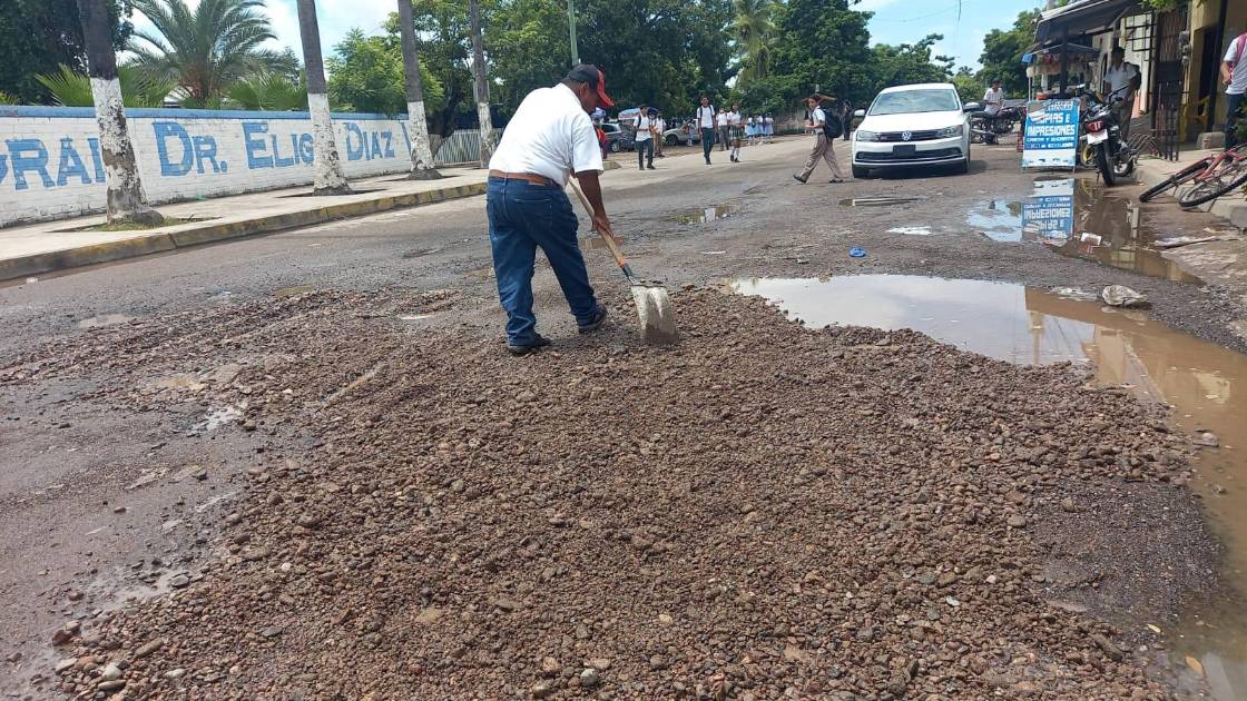 Comerciantes de Escuinapa rellenan con grava baches en camino a zona escolar