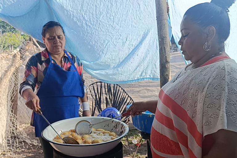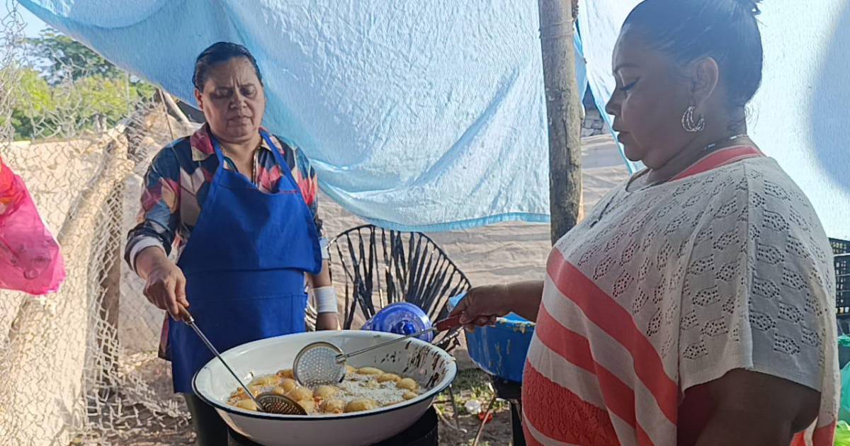 Alrededor de esa cazuela con aceite, Marcía Aguilar mueve las cucharas a la vez que deposita las bolas de harina preparada en lo que serán los bollitos y gorditas de maíz para acompañar el atole de pinole y coco.