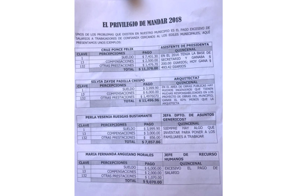 La hoja repartida fue titulada “El Privilegio de Mandar”, con la que presuntamente intentaron exhibir a la Alcaldesa Fernanda Oceguera Burques, y que también muestra que dichos trabajadores ganan más que el director de Obras Públicas, Jesús Contreras Sandoval, que tiene un salario de 7 mil 500 pesos.