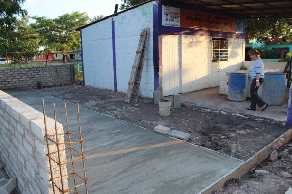 En cuanto a la ampliación del EAEyD de la comunidad La Hacienda La Campana, en el progreso de la contracción se cuanta con la mitad del piso cimentado y se están edificando las paredes.