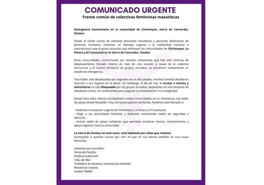 “Desde hace años, hemos acompañado a estas comunidades en su resistencia, con redes de apoyo desde Mazatlán. Hoy, con preocupación profunda, hacemos este llamado a: - Visibilizar la situación urgente de Chirimoyos, La Petaca y El Cuatantal. - Exigir a las autoridades estatales y federales condiciones reales de seguridad y atención. - Activar redes de apoyo solidarias que permitan movilizar víveres, medicamentos y apoyo logístico hacia la comunidad”.