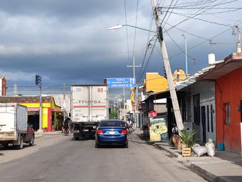 ESCUINAPA._ Un poste que sirve para cableado de alta tensión está en riesgo de caer por una de las calles principales de la ciudad.