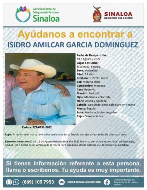 De acuerdo a la ficha de alerta, el ex dirigente de la Asociación Ganadera Local tiene 63 años y fue visto por ultima vez el 19 de agosto por las calles de la ciudad, cuando circulaba en una camioneta Ford tipo lobo, si se tiene alguna información se puede llamar a los teléfonos 6691057953 o al 6693278424.