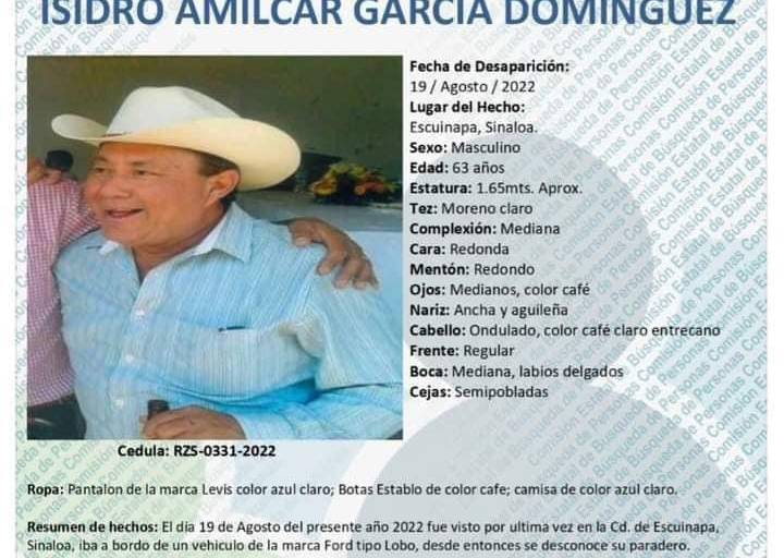 ESCUINAPA._ La Comisión Estatal de Búsqueda de Desaparecidos emitió hoy miércoles una alerta de búsqueda del ex dirigente ganadero Isidro Amílcar García Domínguez.