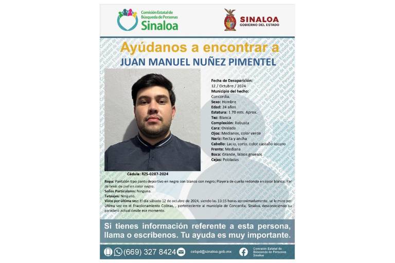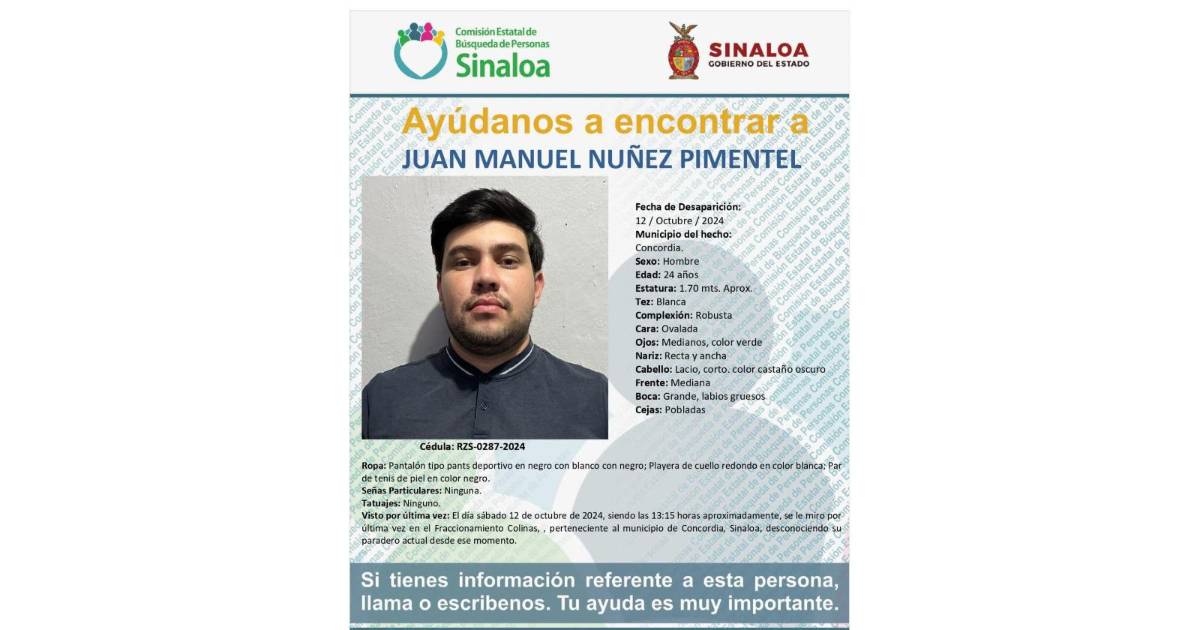 Juan Manuel Núñez Pimentel, de 24 años, se encuentra desaparecido desde la tarde del pasado sábado 12 de octubre cuando fue visto por última vez en el Fraccionamiento Colinas, perteneciente al municipio de Concordia, Sinaloa, informó la Comisión Estatal de Búsquedas de Personas Sinaloa, tras emitir la cédula RZS-0287-2024.