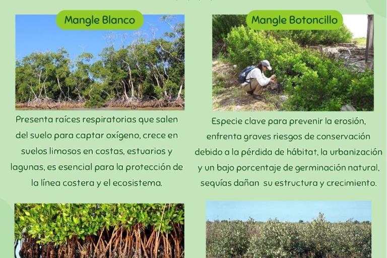 Se detalla que el mangle blanco es esencial para la protección de la línea costera y el ecosistema.