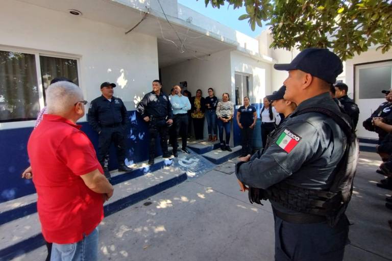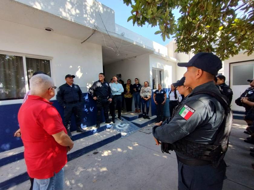 ESCUINAPA._ Agentes de policía y tránsito recibieron al Alcalde Víctor Manuel Díaz Simental y al tesorero, Trinidad Ibarra Martínez, para dialogar sobre el tema de los salarios.