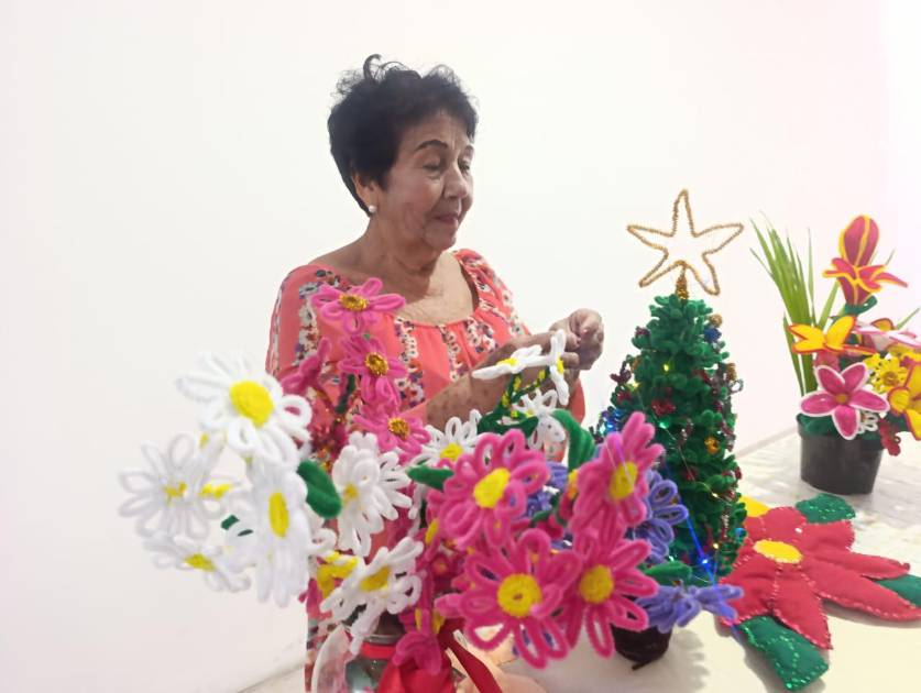 Cada objeto que estará en el pino de Navidad este año, ha sido elaborado por ella, los hace en fieltro con lentejuelas, con telas, con “limpia pipas” y luces, el regalo tiene que ser del gusto de ellos, a quienes conoce bien, por eso sabe que una vela será para uno de sus nietos y un pino para una de sus hijas.