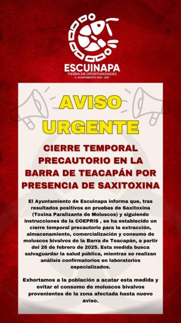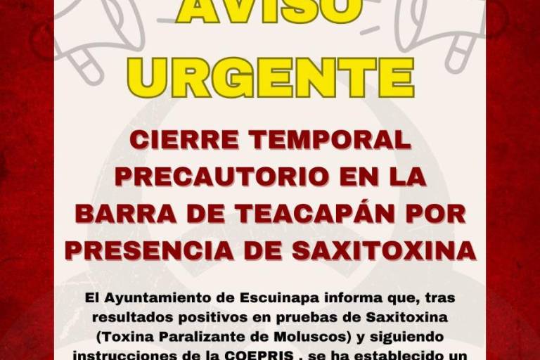 ESCUINAPA._ Ante la presencia de la neurotoxina saxitoxina en moluscos bivalvos, el Ayuntamiento de Escuinapa, en coordinación con Coepriss, emitió este miércoles una alerta urgente del cierre de la Barra de Teacapán.