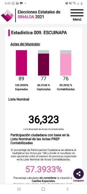 De acuerdo co el PREP, se tienen 89 casillas en el municipio, de las cuales 77 han sido capturas, y 76 contabilizadas hasta las 15:20 horas de este lunes.