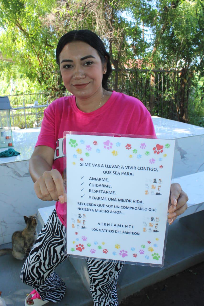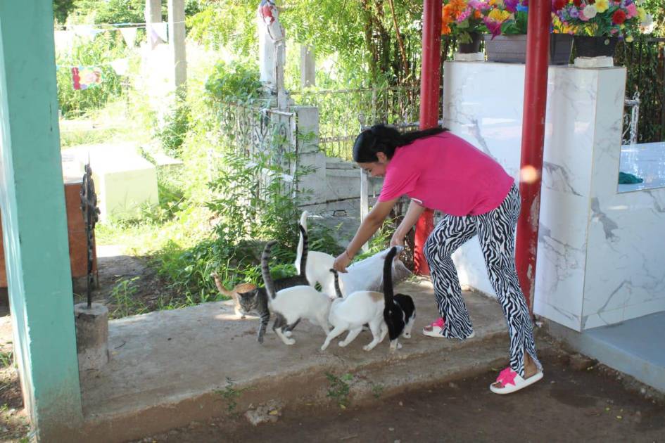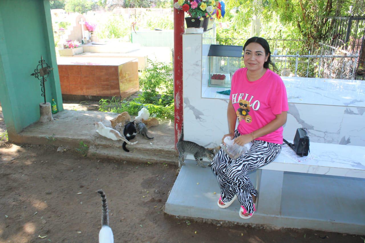 EL ROSARIO._ A penas se percatan los gatitos de la llegada de Daniela Itzel Manjarrez Salmerón al Panteón Municipal y todo se convierte en alegría pues saben que acude a alimentarlos.