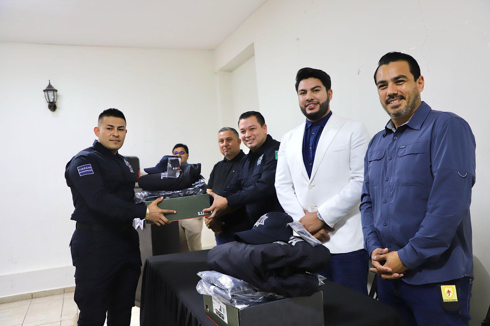 LA CRUZ, Elota._ Con la finalidad de mejorar las condiciones de trabajo de los elementos de la Dirección de Seguridad Pública y Tránsito Municipal (DSPyTM), el Alcalde de Elota, Richard Millán Vázquez, acompañado del director de dicha corporación, hicieron entrega de uniformes a policías municipales.