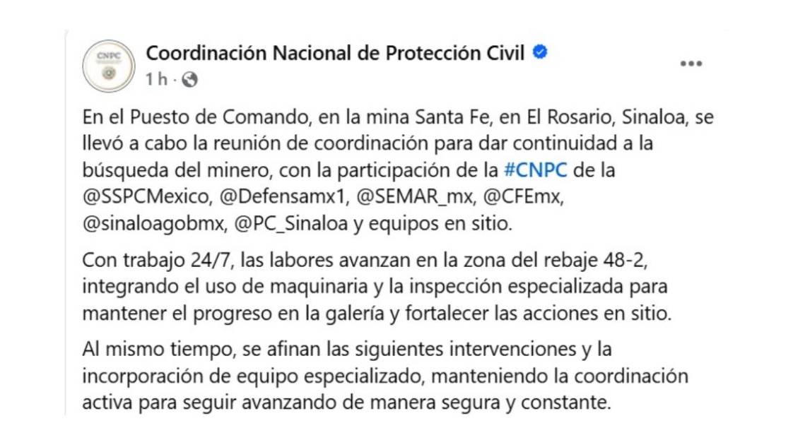 En las labores, se indican que se mantienen todo el día, todos los días, donde participan la Coordinadora Nacional de Protección Civil, Laura Velázquez Alzúa, Secretaría de la Defensa Nacional, Secretaría de Marina, Comisión Federal de Electricidad Nacional, Gobierno del Estado de Sinaloa, Protección Civil Sinaloa, personal de la empresa minero y voluntarios.