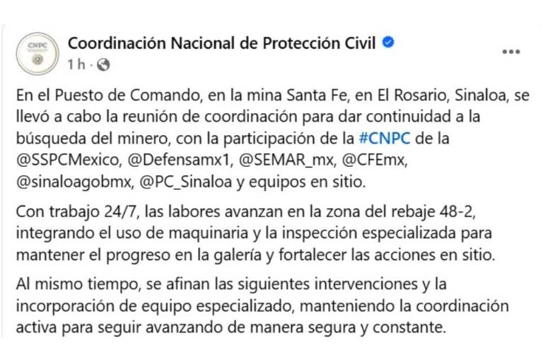 “Se afinan las siguientes intervenciones y la incorporación de equipo especializado, manteniendo la coordinación activa para seguir avanzando de manera segura y constante”, indicó en el comunicado oficial.